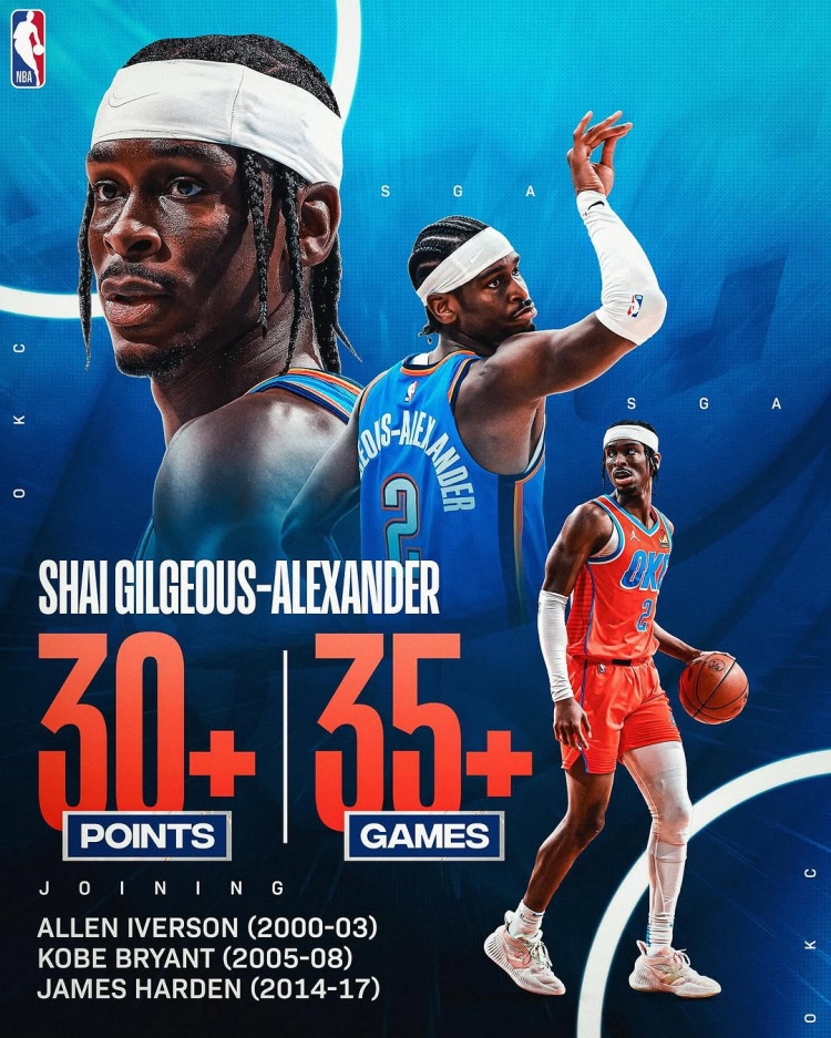 2月27日訊 本賽季至今,雷霆球星亞歷山大已經(jīng)有35場(chǎng)比賽得到至少30分。