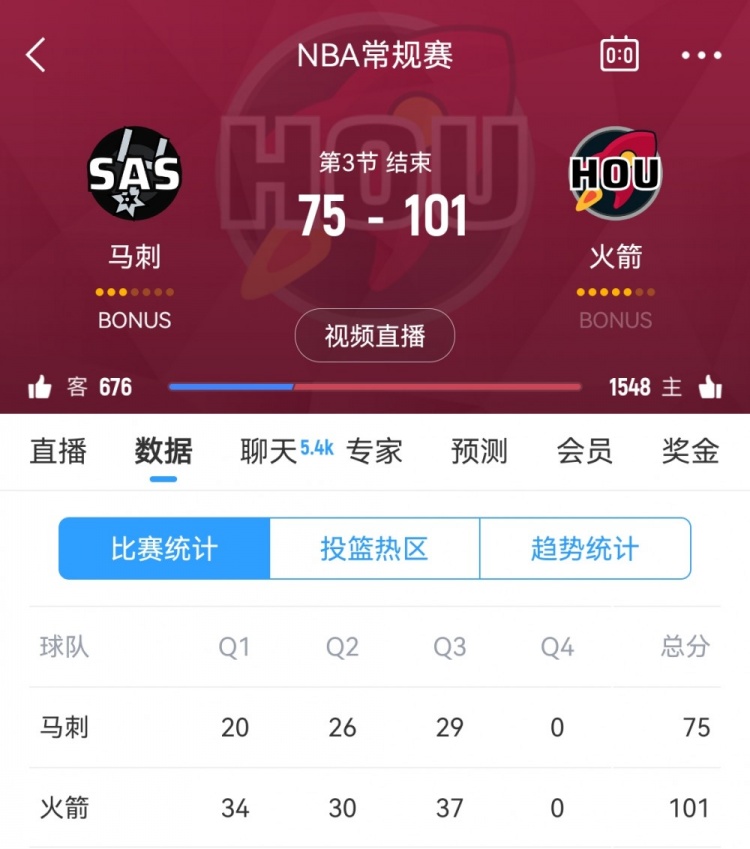 前三節,火箭攻防兩端壓制馬刺,每節單節得分均高于對手,三節打完火箭已獲得26分優(yōu)勢。