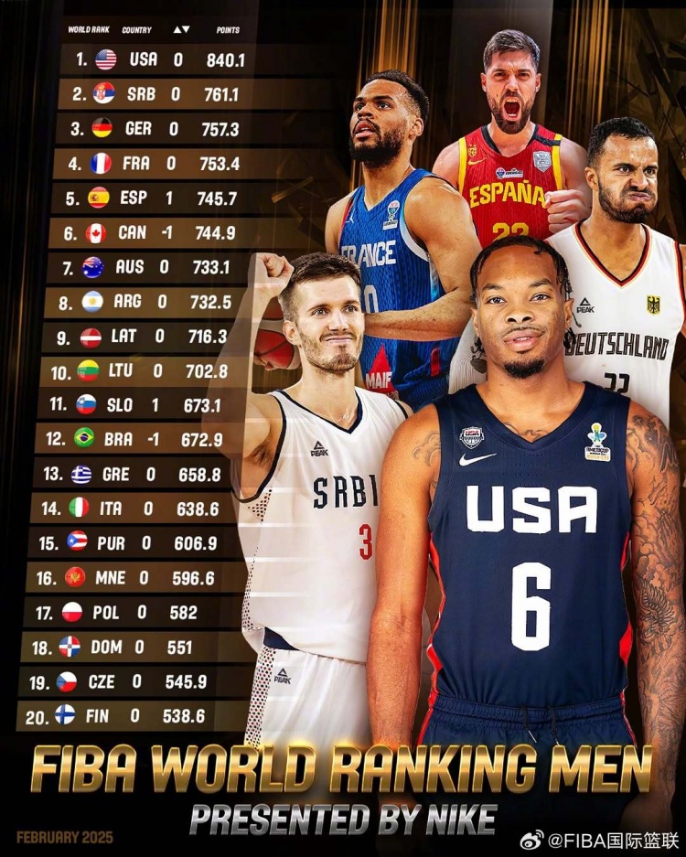 3月1日訊 FIBA官方公布男籃最新世界排名,美國隊穩居榜首,中國男籃繼續排在第30位,亞大區排名第6。