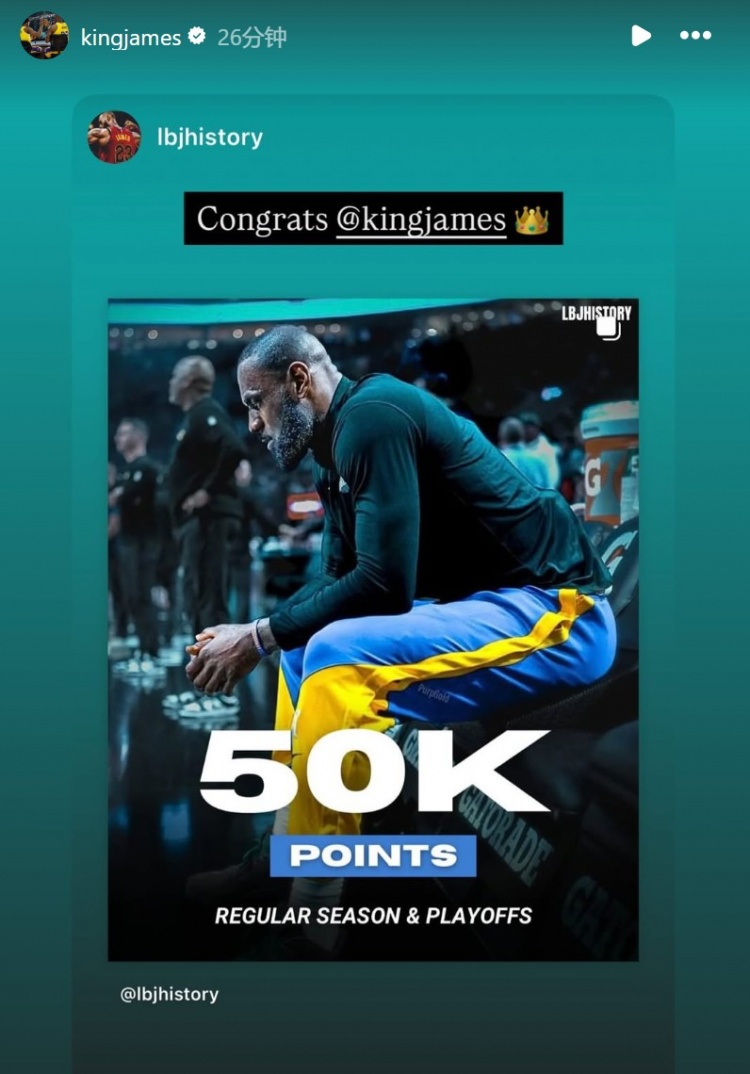 在本場(chǎng)比賽中,詹姆斯生涯總得分突破50000大關(guān);賽后,他轉發(fā)了眾多給自己送祝福的動(dòng)態(tài)。