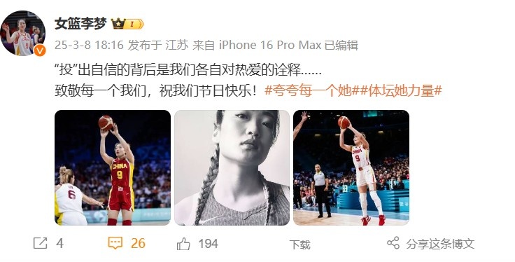 3月8日訊 今日,中國女籃球員李夢(mèng)更新社媒,曬出了一組照片。