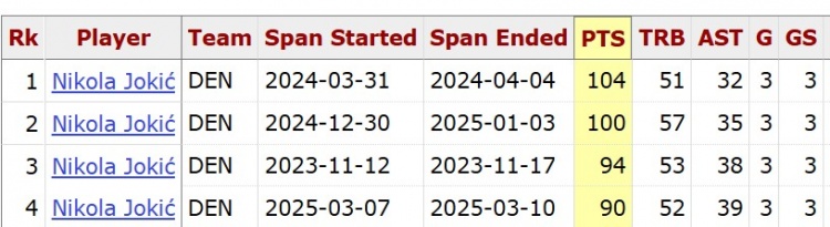 據統計,約基奇在連續3場(chǎng)比賽中至少得到90分50籃板30助攻,自聯(lián)盟合并以來(lái)唯一,而且他生涯已經(jīng)是第4次做到這一點(diǎn)。
