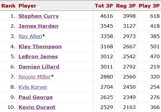 本場(chǎng)比賽過(guò)后,庫里生涯(常規賽+季后賽)的三分命中數來(lái)到4618記,距離5000記還有382記。