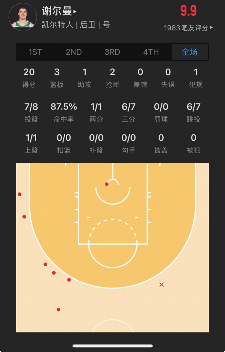 凱爾特人30號秀 貝勒-謝爾曼 登場(chǎng)15.9分鐘