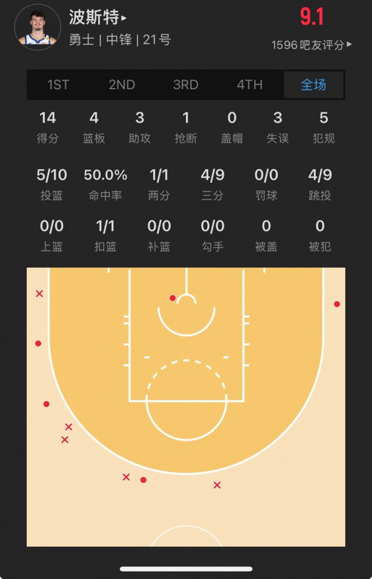 勇士52號秀 昆滕-波斯特 登場(chǎng)23.1分鐘
