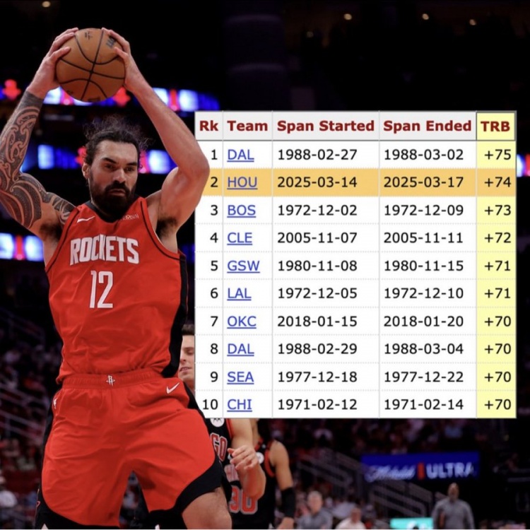 據統計,火箭能在3場(chǎng)比賽區間里比對手多搶74個(gè)籃板,歷史第2多,僅次于1988年的獨行俠(75個(gè))。