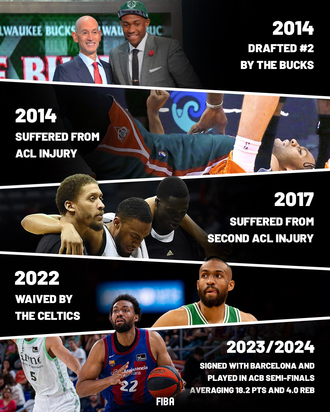 賈巴里-帕克2014年參加選秀被雄鹿以榜眼簽選中,2014年新秀賽季左膝前十字韌帶斷裂,賽季報銷(xiāo)。