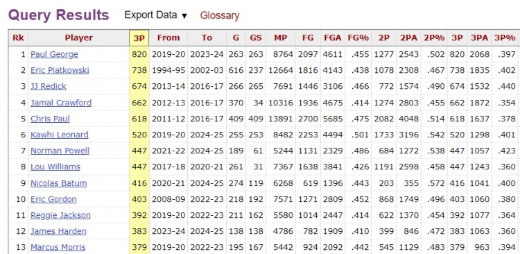 根據數據統計,加上已經(jīng)投進(jìn)的1個(gè)三分,鮑威爾快船生涯三分數來(lái)到448記,他超越路威,獨居隊史三分榜第7位。