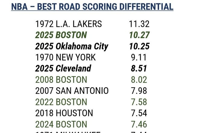 據統計,本場(chǎng)比賽過(guò)后,凱爾特人的賽季場(chǎng)均客場(chǎng)凈勝分來(lái)到10.27,超越本賽季的雷霆(10.25),升至歷史第二位,僅次于1972年的湖人。