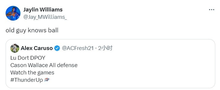 比賽結束后,卡魯索在社媒上為隊友多特和華萊士發(fā)聲,他在個(gè)人推特上寫(xiě)道:“多特DPOY,華萊士最佳防守陣容?!?/p>