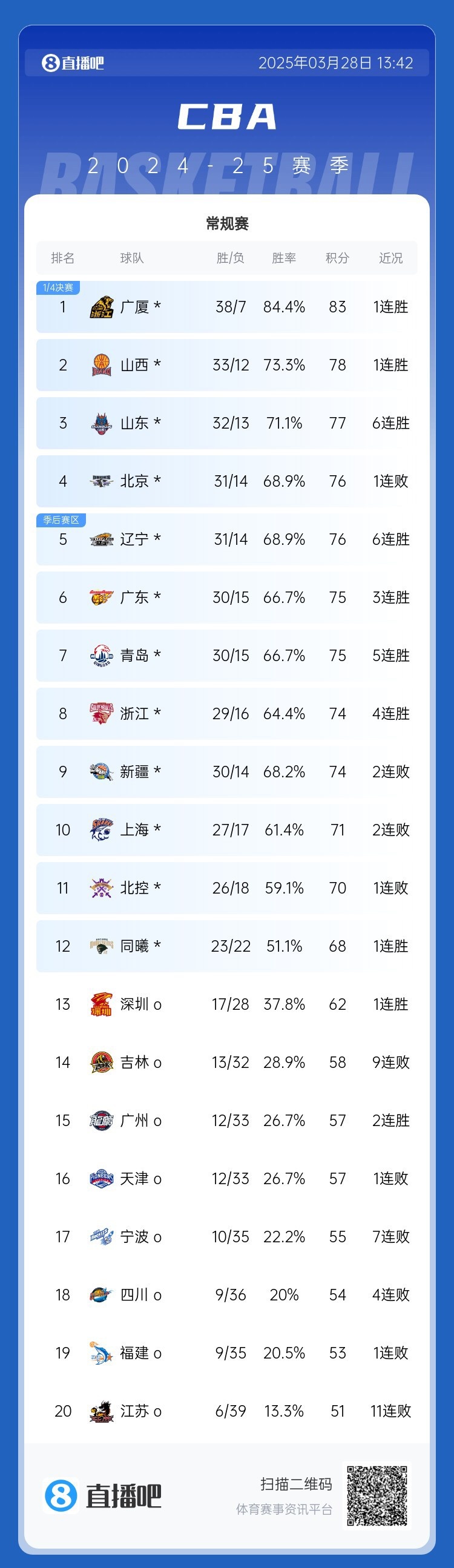 3月28日訊 本賽季常規賽第45輪昨晚已經(jīng)全部結束,本輪比賽過(guò)后,本賽季的排名形勢進(jìn)一步明朗。