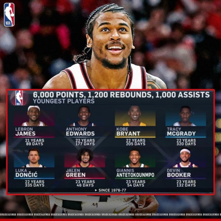 至此,杰倫-格林生涯得分、籃板、助攻數來(lái)到了6040/1283/1003,他成為了聯(lián)盟自1976-77賽季合并以來(lái)達成生涯6000分1200板1000助第六年輕的球員(23歲46天),具體如下: