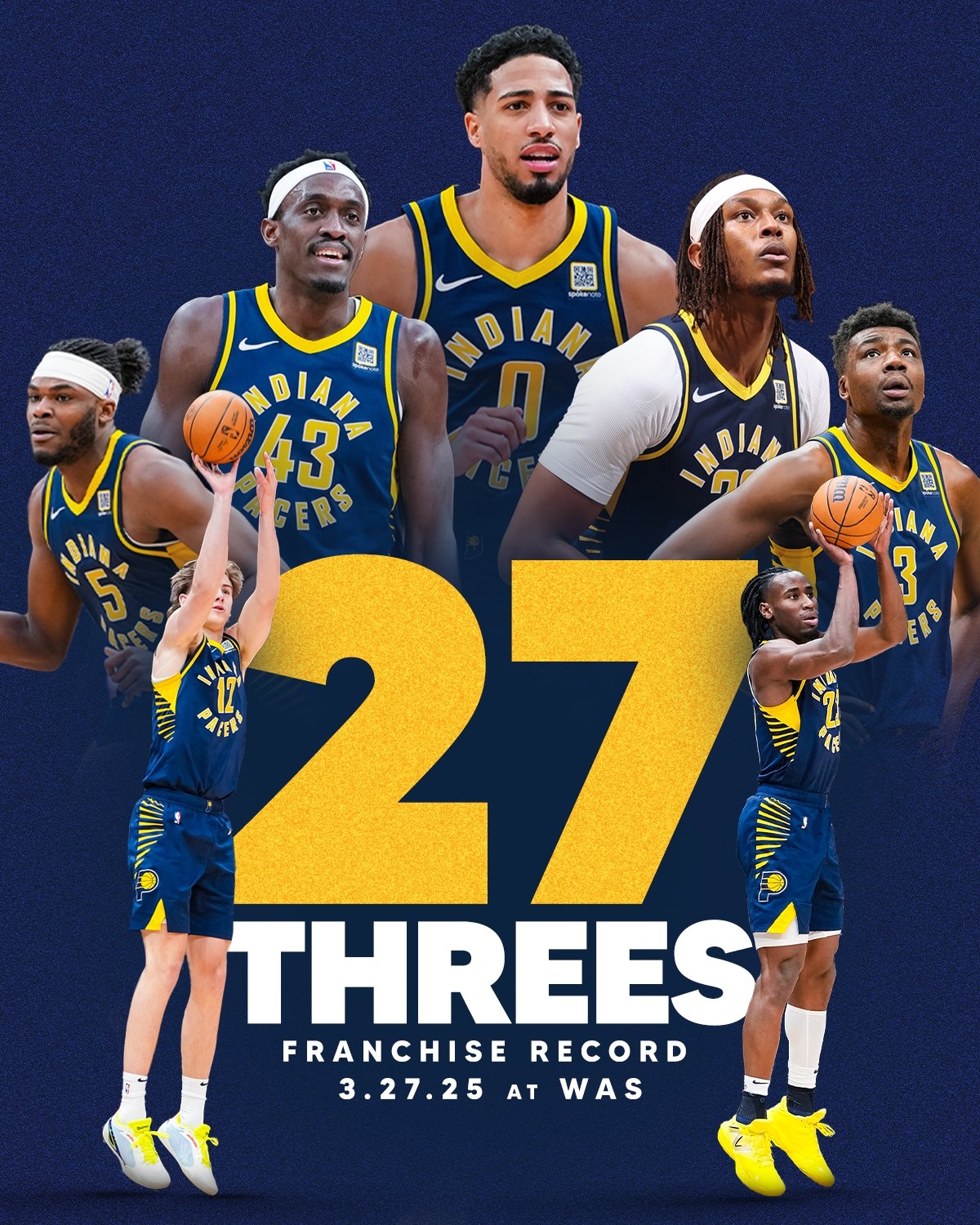 此役,步行者全隊命中27記三分,創(chuàng )造隊史紀錄,此前最多是23記三分。