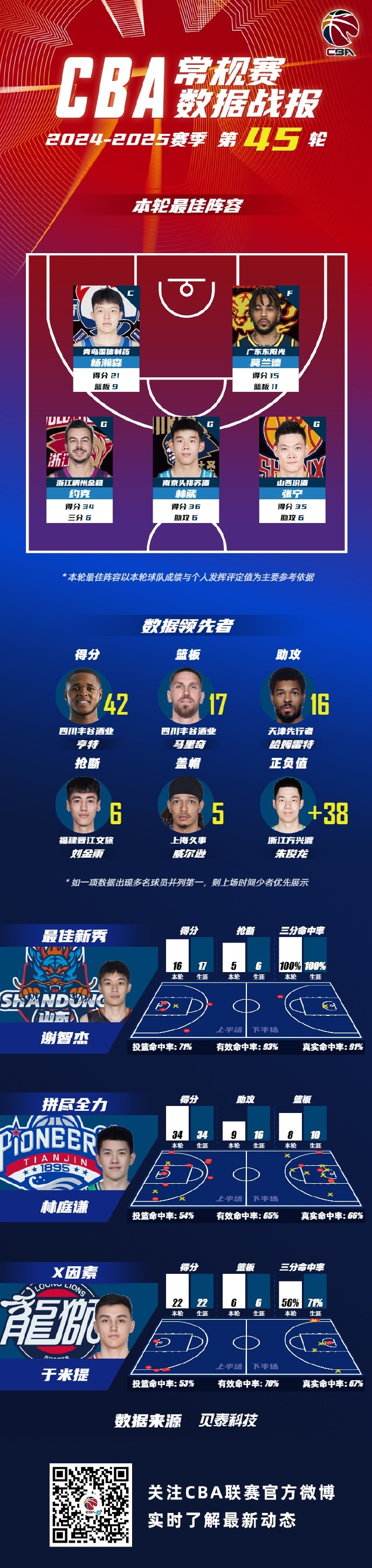 數據領(lǐng)先者方面:四川藍鯨籃球俱樂(lè )部球員亨特以單場(chǎng)42分的數據領(lǐng)銜得分榜;
