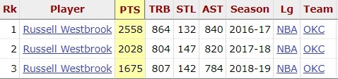 第一位是威少,他有過(guò)3個(gè)賽季做到。