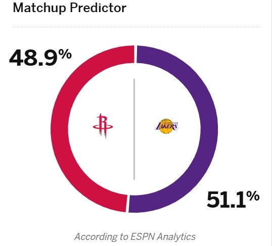今天,ESPN預測本場(chǎng)比賽勝率,湖人51.1%略占優(yōu)勢,火箭(背靠背第二戰)48.9%。