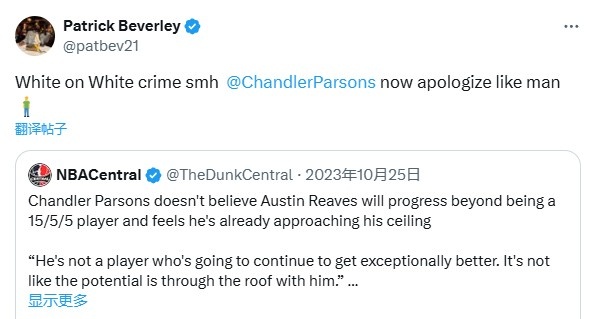 今天,貝弗利則打臉帕森斯,轉發(fā)了后者曾說(shuō)“里夫斯15+5+5就已經(jīng)到極限了”的言論,并寫(xiě)道:“白人看不起白人,無(wú)語(yǔ)了,像個(gè)男人一樣出來(lái)道歉!”