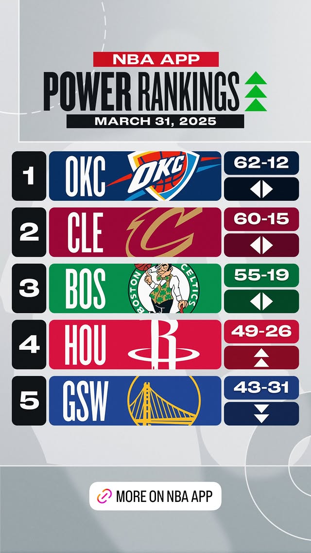 04月01日訊 今日NBA官方更新了最新一期戰力榜。雷霆仍居第一,近13場(chǎng)12勝的火箭狂飆4位升至前四,湖人跌出前五。