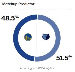 ESPN給出了本場(chǎng)比賽勝率預測,其中勇士48.5%,灰熊為51.5%。