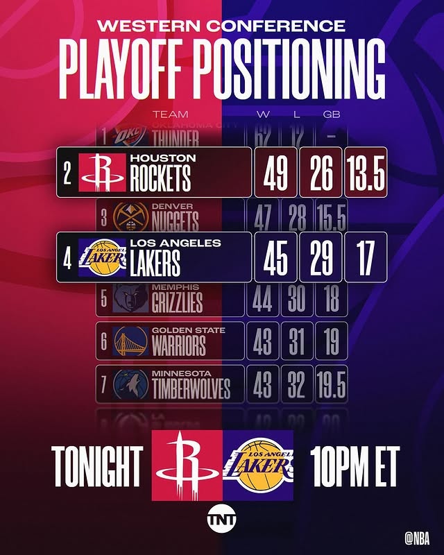 目前火箭49勝26負西部第二,湖人45勝29負西部第四。
