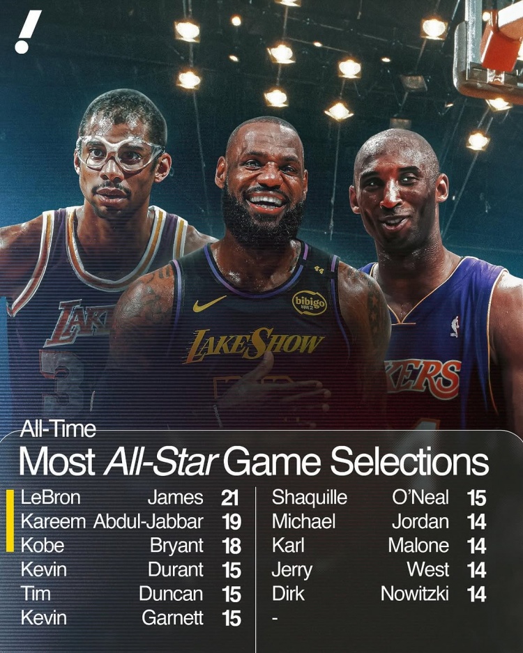 全明星次數總榜:詹姆斯21次高居榜首 科比第三 KD與三大名宿并列-樂(lè )球直播