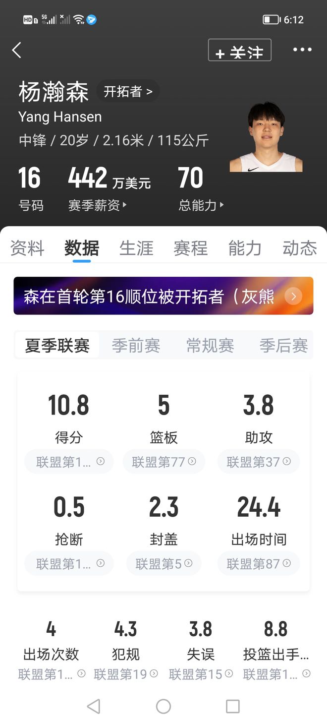楊瀚森夏聯(lián)則場(chǎng)均出場(chǎng)24.5分鐘,場(chǎng)均數據是10.8分5籃板3.8助攻2.3封蓋,命中率45.7%,三分命中率33.3%。