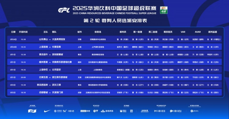2月28日訊 中超官方公布中超第2輪裁判安排,麥麥提江將吹罰申花vs國安的焦點(diǎn)大戰。