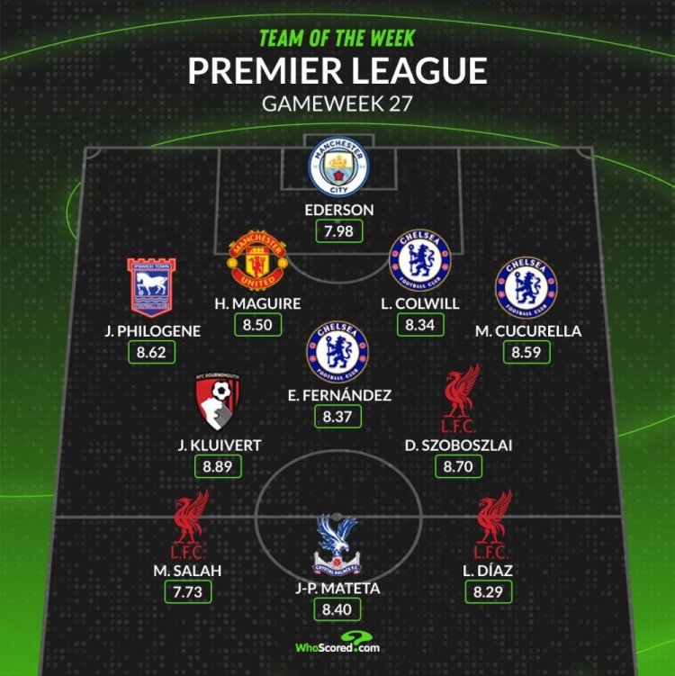 后衛:菲洛金(伊普斯維奇,8.62分)、馬奎爾(曼聯(lián),8.50分)、科爾維爾(切爾西,8.34分)、庫庫雷利亞(切爾西,8.59分)