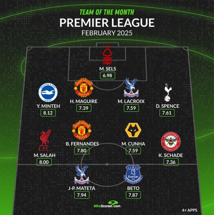3月1日訊 英超2月比賽已經(jīng)完賽,whoscored也統計了本月評分最佳陣容,水晶宮和曼聯(lián)各2人入選。