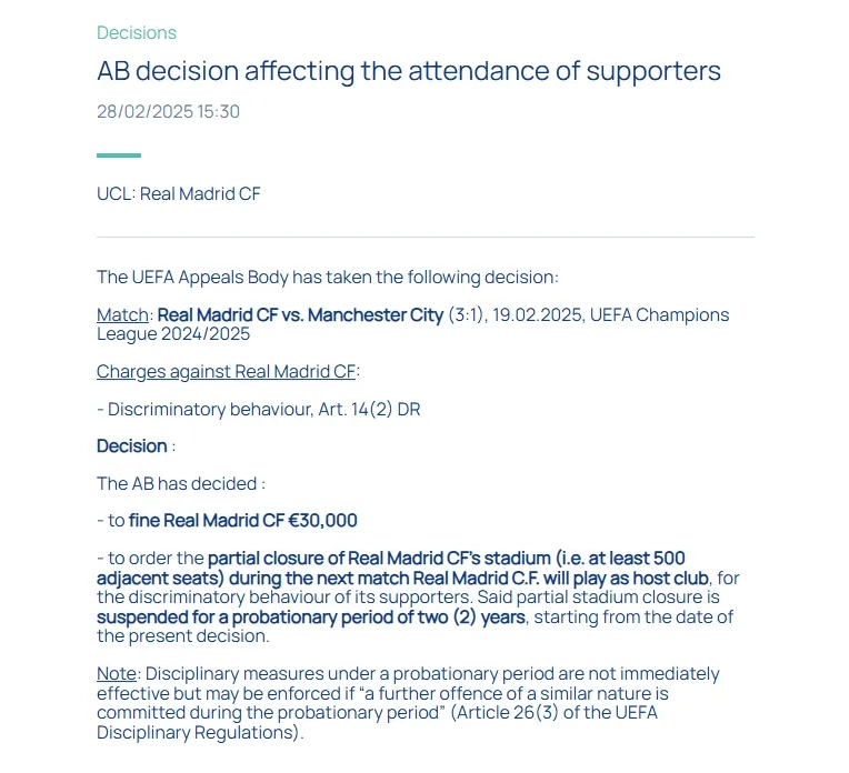 這一“有條件處罰”機制意味著(zhù),只有當皇馬球迷在2026年2月前再次被證實(shí)存在歧視行為時(shí),伯納烏球場(chǎng)才會(huì )實(shí)際執行看臺關(guān)閉措施。歐足聯(lián)在聲明中強調,該裁決體現了對歧視行為“零容忍但給予改正機會(huì )”的雙重原則。