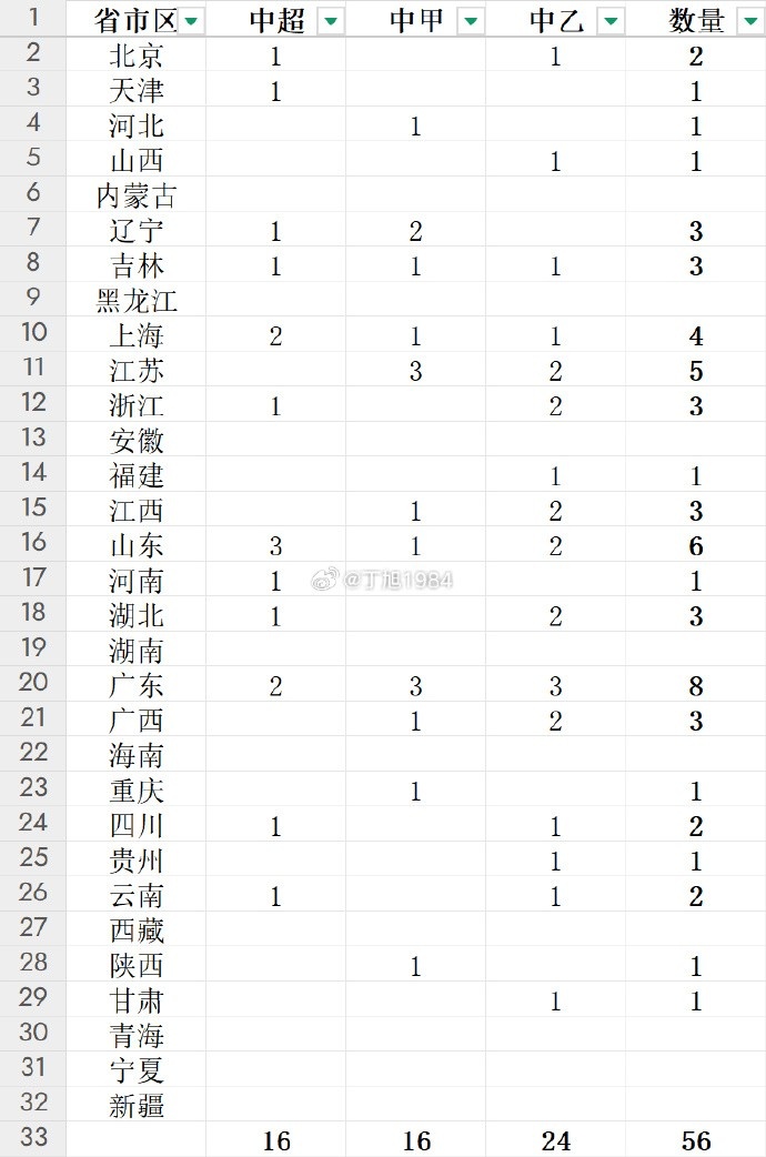 各級聯(lián)賽方面,山東省是中超聯(lián)賽球隊最多的省市區(3支)、廣東省則是中甲和中乙球隊最多的省市區(各3支)。