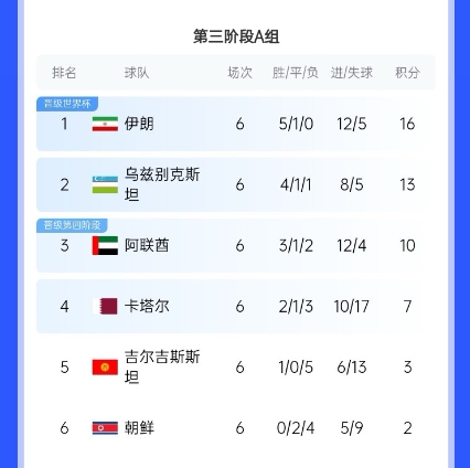 目前在世預賽亞洲區A組積分榜上,阿聯(lián)酋6輪3勝1平2負排在第三,距離第二的烏茲別克斯坦差3分。