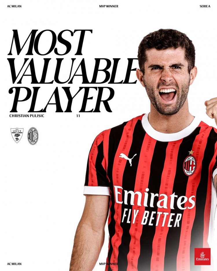 普利西奇本場(chǎng)打進(jìn)兩球,據米蘭官方社媒消息,他也被評為此役隊內最佳球員。