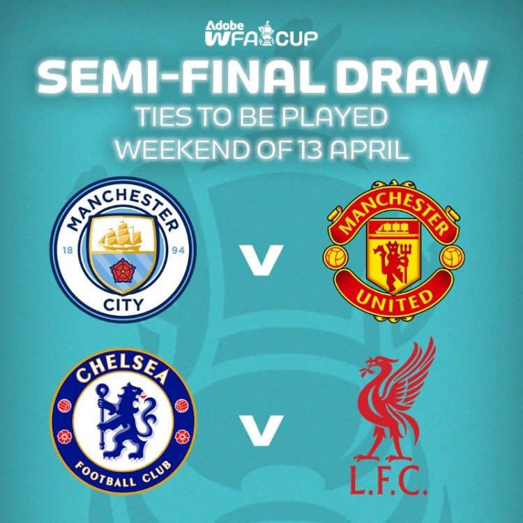 經(jīng)過(guò)抽簽,女足足總杯半決賽對陣為曼城vs曼聯(lián)、切爾西vs利物浦,比賽將于4月13日的那個(gè)周末進(jìn)行。