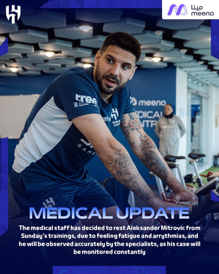 3月10日訊 據利雅得新月官方消息,米特洛維奇因疲勞和心律不齊在周日訓練中休息。