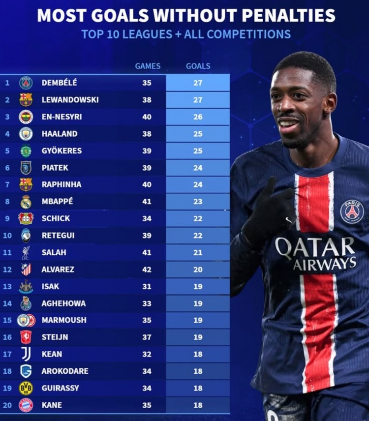 本賽季各項賽事無(wú)點(diǎn)球射手榜: