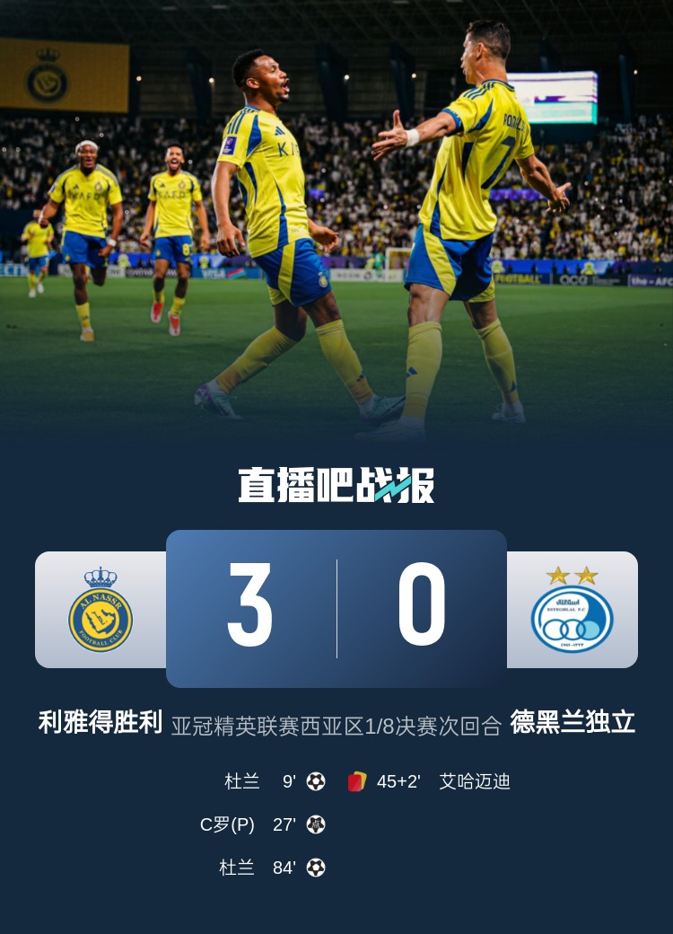 亞冠精英聯(lián)賽西亞區1/8決賽次回合,C羅進(jìn)球,杜蘭梅開(kāi)二度,利雅得勝利3-0德黑蘭獨立,晉級亞冠八強。