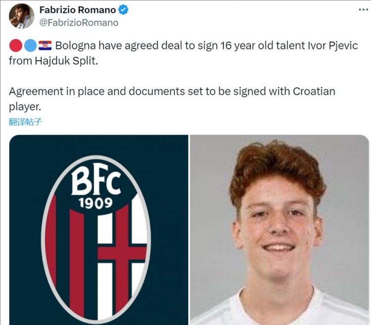3月11日訊 據記者羅馬諾消息,博洛尼亞簽下克羅地亞16歲天才伊沃爾-普耶維奇。