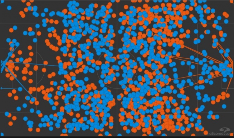 皇馬的比賽節奏在于邊路的機會(huì ),第一戰他們總共的642次傳球有218次發(fā)生在進(jìn)攻三區,這比馬競要高出不少。其中,左右路傳遞次數則占據了他們在進(jìn)攻三區的大部分選擇,再加上他們本賽季其他比賽的數據分析可確定,這就是皇馬的比賽風(fēng)格。