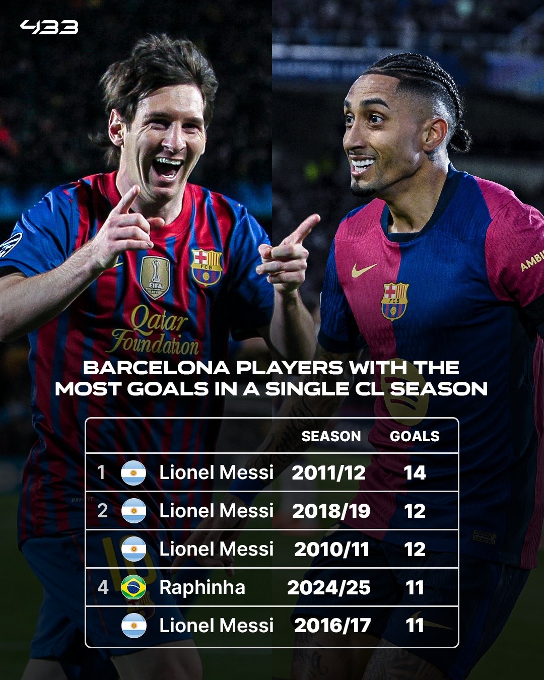 巴薩隊史個(gè)人單賽季進(jìn)球紀錄中,拉菲尼亞本賽季11球進(jìn)入前五,其余四席均是梅西。