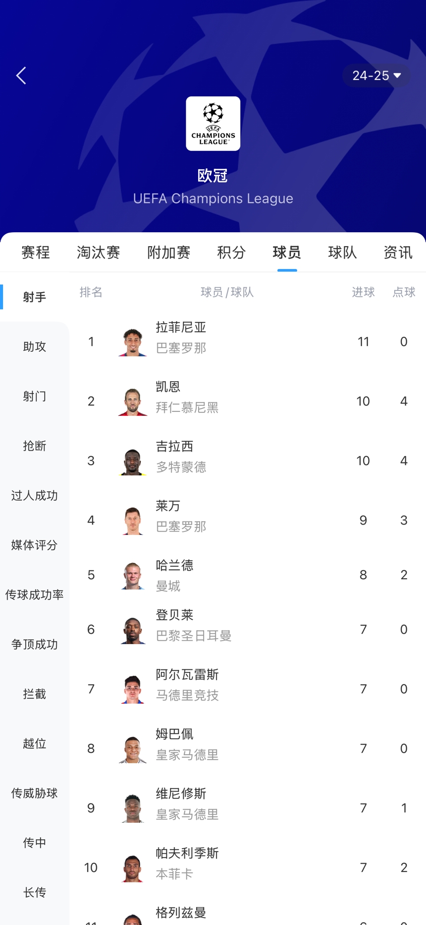 本賽季歐冠,拉菲尼亞出戰10場(chǎng)貢獻11球5助攻。