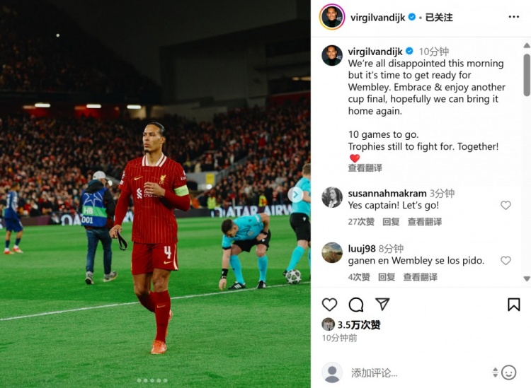 范迪克也在社媒發(fā)文寫(xiě)道:“今天早上我們每個(gè)人都很失望,但現在是時(shí)候為溫布利球場(chǎng)的決賽做好準備了。擁抱并享受又一場(chǎng)決賽,希望我們能再次把獎杯帶回家。賽季還剩10場(chǎng)比賽,還要為冠軍而拼搏。我們一起加油!”
