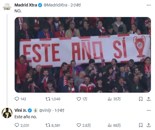 本場(chǎng)比賽馬競球迷在看臺舉起橫幅:歐冠就今年了!皇馬的球迷號曬出橫幅并表示NO,維尼修斯社媒回復該球迷號:今年,NO!