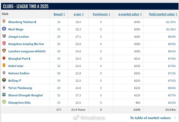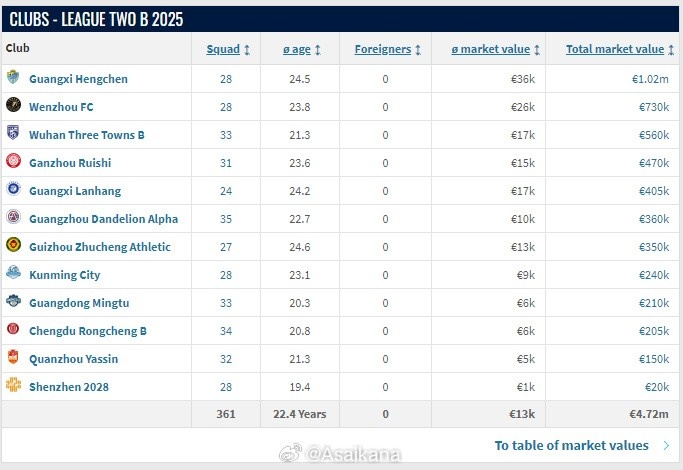 2025賽季中乙各隊名單已在轉會(huì )市場(chǎng)網(wǎng)更新。球隊總身價(jià)方面,山東泰山B隊以135萬(wàn)歐元列第一,后面依次是無(wú)錫吳鉤(108萬(wàn)歐)、廣西恒宸(102萬(wàn)歐)、江西廬山(83.5萬(wàn)歐)、杭州臨平吳越(83.5萬(wàn)歐)、蘭州隴原競技(81萬(wàn)歐)、上海海港B隊(74.5萬(wàn)歐)、湖北青年星(74.5萬(wàn)歐)、溫州(73萬(wàn)歐)、南通海門(mén)珂締緣(71.5萬(wàn)歐)、北京理工(70萬(wàn)歐)、泰安天貺(64.5萬(wàn)歐)、武漢三鎮B隊(56萬(wàn)歐)、贛州瑞獅(47萬(wàn)歐)、廣西藍航(40.5萬(wàn)歐)、山西崇德榮海(37萬(wàn)歐)、廣州蒲公英(36萬(wàn)歐)、貴州筑城競技(35萬(wàn)歐)、昆明城市(24萬(wàn)歐)、廣東銘途(21萬(wàn)歐)、長(cháng)春喜都(21萬(wàn)歐)、成都蓉城B隊(20.5萬(wàn)歐)、泉州亞新(15萬(wàn)歐)、深圳二零二八(2萬(wàn)歐)。