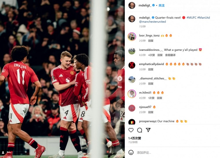 德里赫特也在賽后曬出和隊友的慶祝照,并配文:“下一站八強!@曼聯(lián)俱樂(lè )部?!?/p>