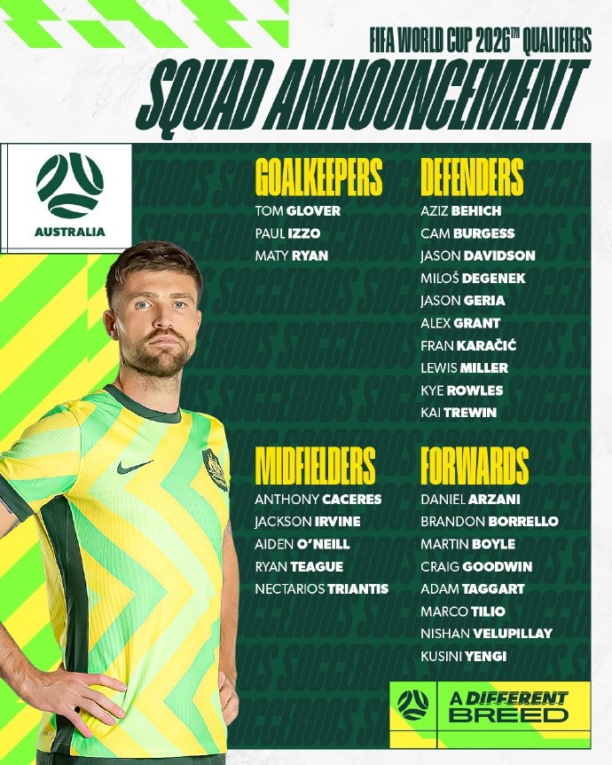 與去年11月的大名單相比,澳大利亞隊更換了12名球員,主因就是嚴重的傷病潮。至少有5名波波維奇時(shí)代的18強賽的主力缺席,包括后衛齊卡蒂、蘇塔,中場(chǎng)博斯、麥克格林和前鋒杜克。波波維奇征召了4名從未入選過(guò)國家隊的新人以及兩位2022年后再未入選的“半新人”填坑。