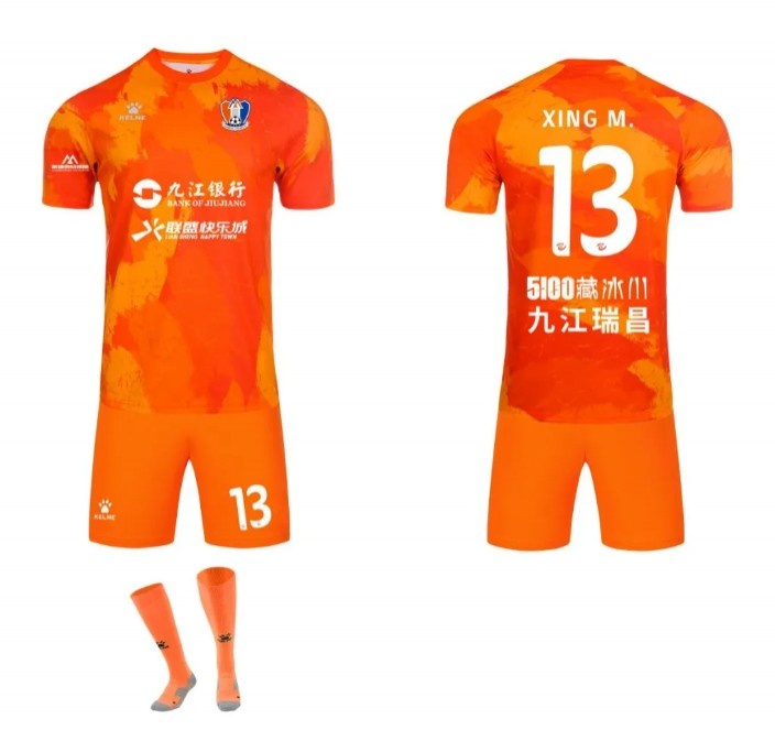 主場(chǎng)戰袍延續了江西廬山隊經(jīng)典的橙色主色調,象征著(zhù)激情、活力與勝利。球衣正面采用漸變設計,猶如長(cháng)江之水奔流不息,寓意著(zhù)江西足球生生不息,勇往直前。球衣背面印有“九江瑞昌”字樣,彰顯著(zhù)球隊為江西、為九江、為瑞昌榮譽(yù)而戰的決心。