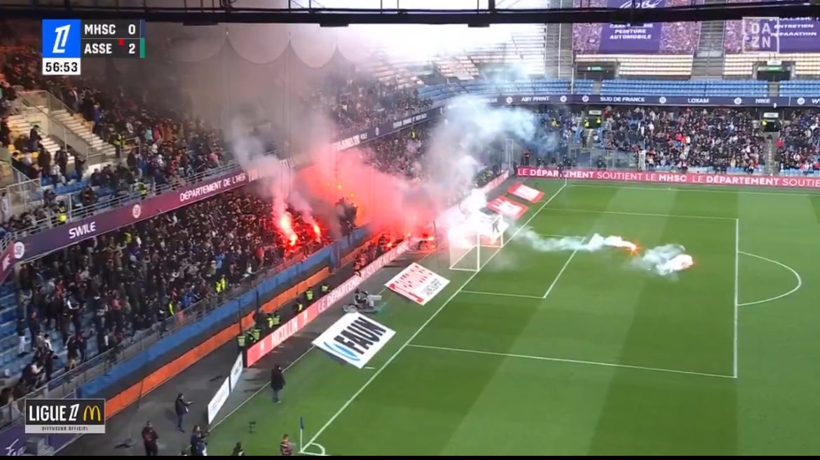 據報道,比賽期間,主場(chǎng)的蒙彼利埃球迷們開(kāi)始燃放煙火,導致看臺出現了小型火災,最終比賽被腰斬。