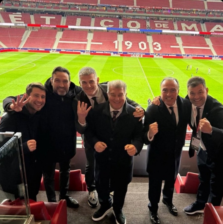 包括主席拉波爾塔在內的一眾高層賽后在現場(chǎng)合影留念慶祝,多人手中還比出了“4”的手勢。