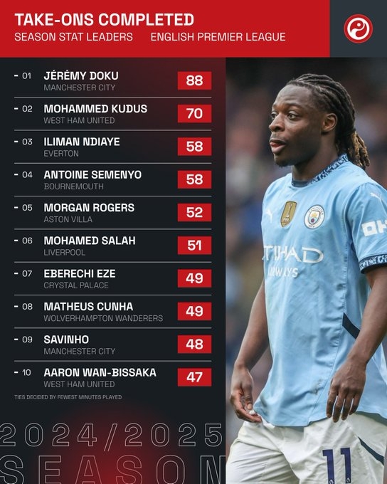 3月18日訊 曼城在本輪英超2-2戰平布萊頓,多庫單場(chǎng)13次成功過(guò)人。squakwa也統計了本賽季英超成功過(guò)人榜,多庫獨自領(lǐng)跑。